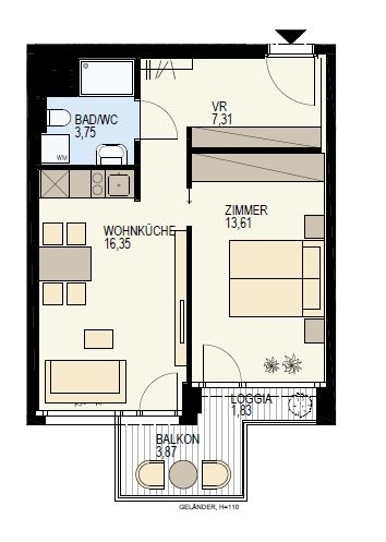 Mit zwei gut durchdachten Zimmern, darunter ein gemütliches Schlafzimmer, bietet diese exklusive Wohnung ausreichend Platz zum Entspannen. Das großzügige Badezimmer und eine kleine Loggia runden das Raumangebot perfekt ab.