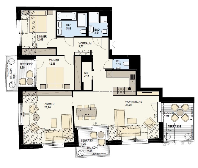 • Attraktive Freibereiche, Balkone, Terrassen, Loggien
