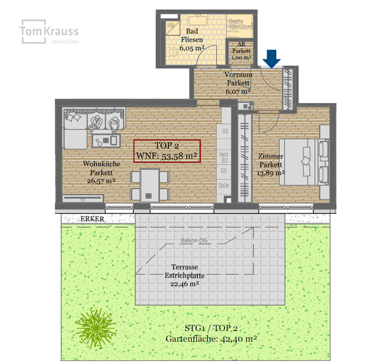 Diese charmante 2-Zimmer-Gartenwohnung bietet ca. 53,6 m² Wohnfläche, eine sonnige Terrasse (22,5 m²) sowie einen Eigengarten (42,4 m²). Der helle Wohn-/Essbereich (26,6 m²) mit Zugang ins Freie, ein Schlafzimmer, ein modernes Bad mit Dusche und ein Abstellraum runden das Angebot ab – ideal für Singles oder Paare.