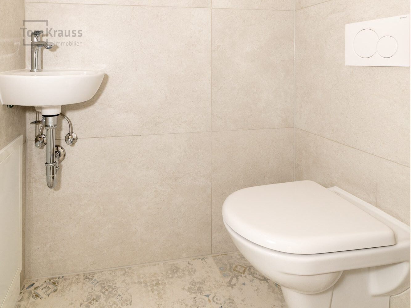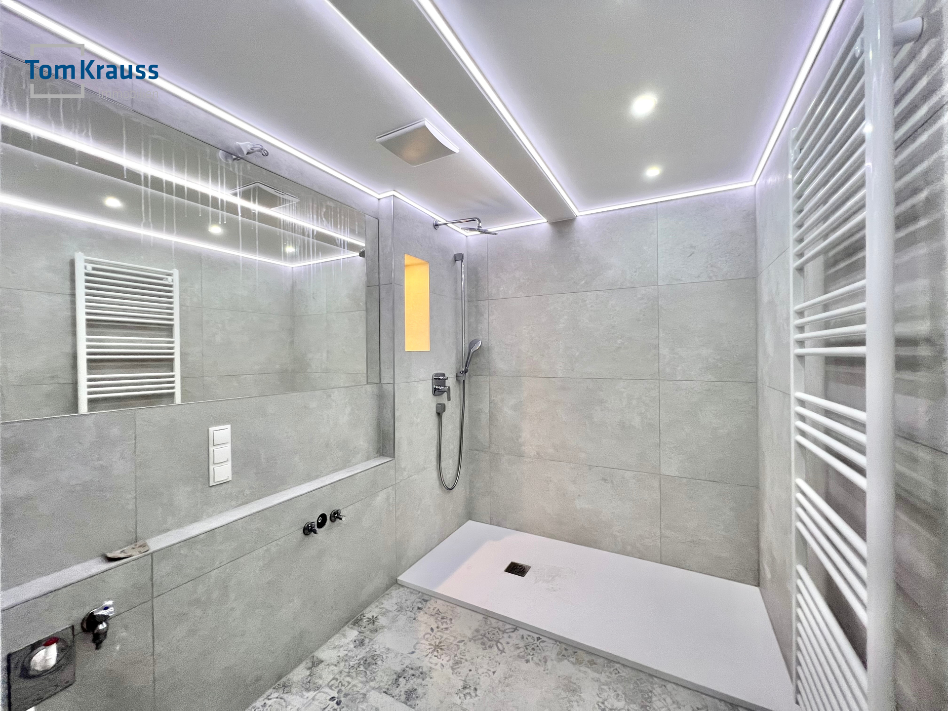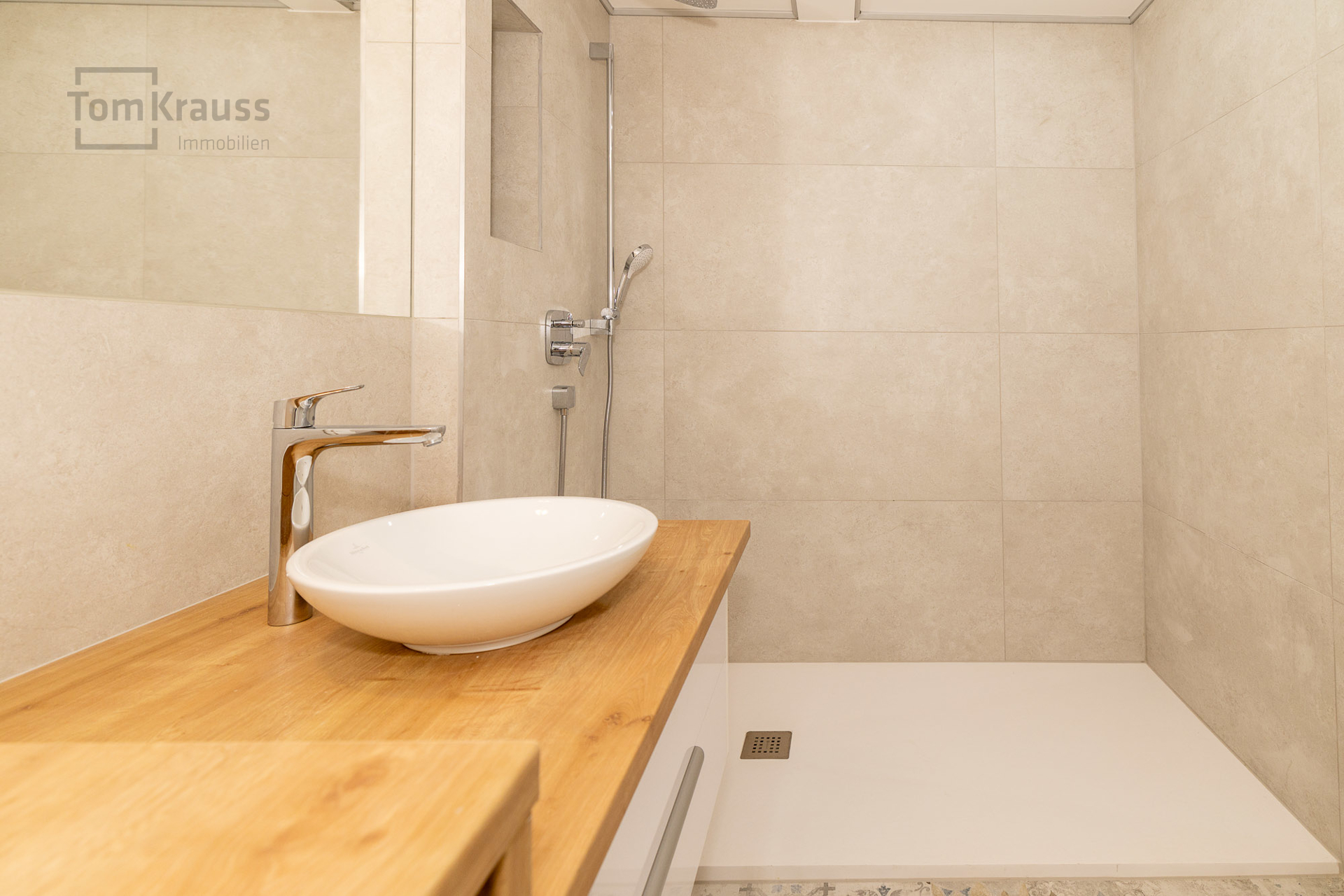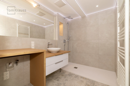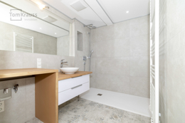 Edler Eichenparkett, eine Deckenkühlung sowie eine zusätzliche Klimaanlage garantieren höchsten Wohnkomfort zu jeder Jahreszeit. Das Bad präsentiert sich modern und stilvoll mit bodengleicher Dusche, großformatigen Fliesen und eleganter Ausstattung.