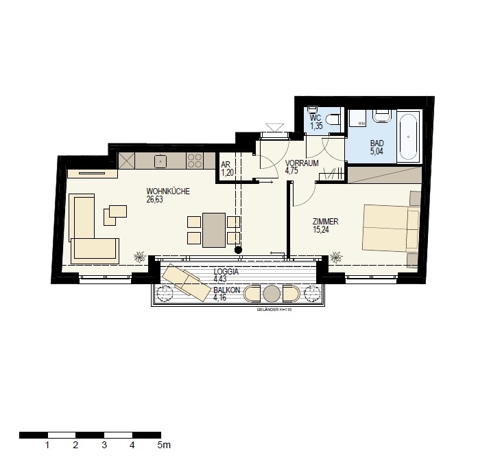 Helle 2-Zimmer-Wohnung im 5. Stock mit Loggia und Terrasse in ruhiger Lage.