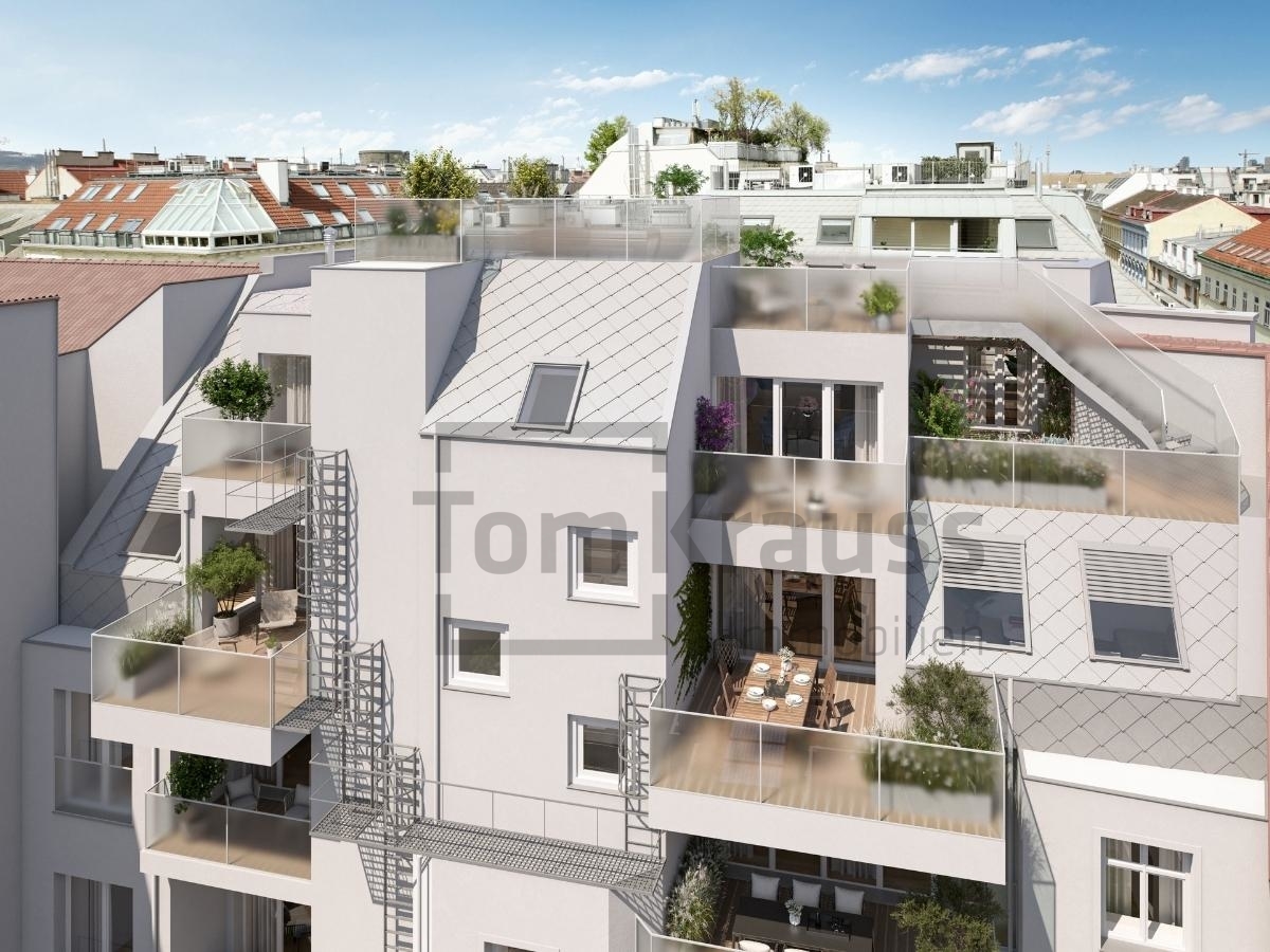 Exklusive 4 Zimmer-Dachgeschosswohnung mit Südwest-Terrasse. In sehr guter Lage des 2. Bezirkes Nähe Augarten und Donaukanal wird ein Altbau stilvoll saniert und das Dachgeschoss zu Luxusobjekten ausgebaut.