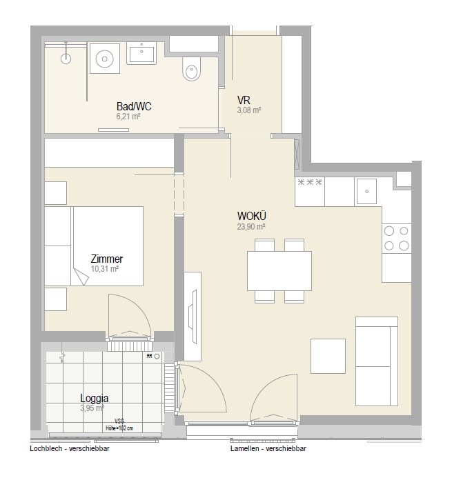 Living at the sunny side ist das Motto dieser süßen 2 Zimmer Wohnung. Ihr neues Zuhause besteht aus einem Vorraum, einem Duschbad mit WC, einer hellen und dadurch luftigen Wohnküche sowie einem Schlafzimmer. Die sonnige Seite des Lebens, können Sie auf Ihrer südseitig ausgerichteten Loggia genießen.