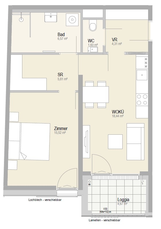 Das Highlight der Wohnung ist die große westseitig ausgerichtete Loggia. Die Nachmittagssonne lässt sich hier in vollen Zügen genießen.