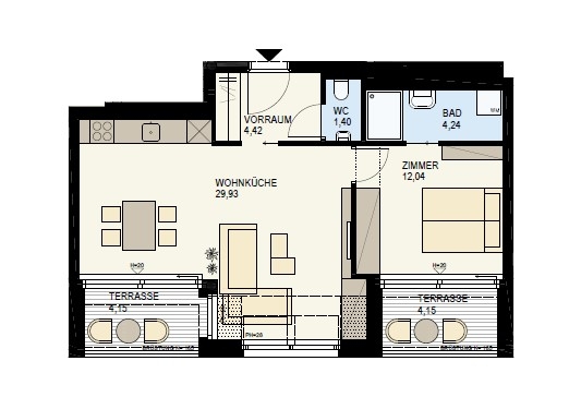 Ihre neue gemütliche Dachgeschosswohnung gliedert sich in einen Vorraum, einer großen, hellen Wohnküche mit Terrasse, einem Schlafzimmer ebenfalls mit Ausgang auf eine weitere Terrasse, ein Badezimmer mit Dusche, sowie einem separatem Gäste WC. Diese schöne Dachgeschoßwohnung besticht durch Ihren Durchdachten Grundriss mit wenigen Schrägen.