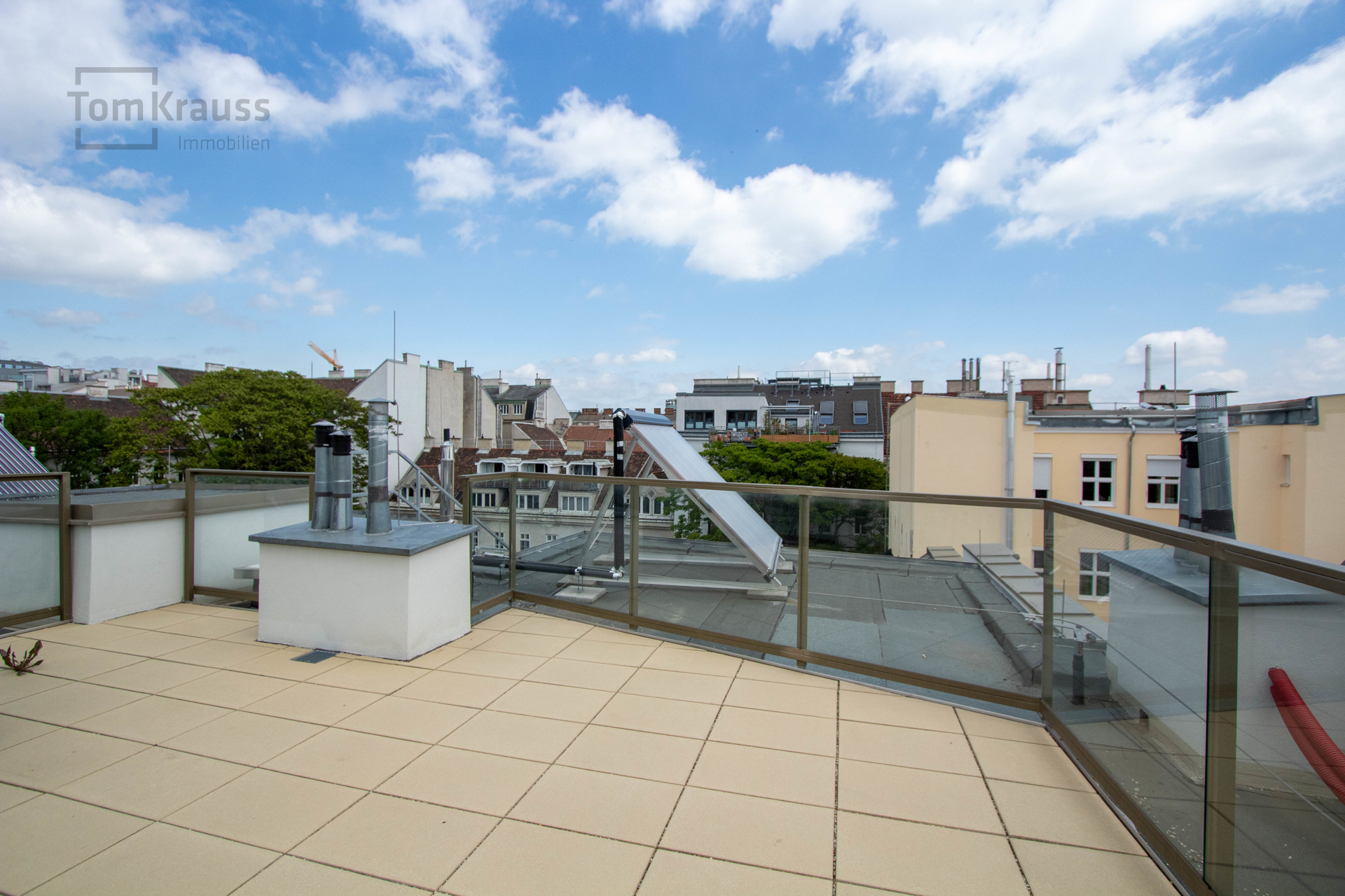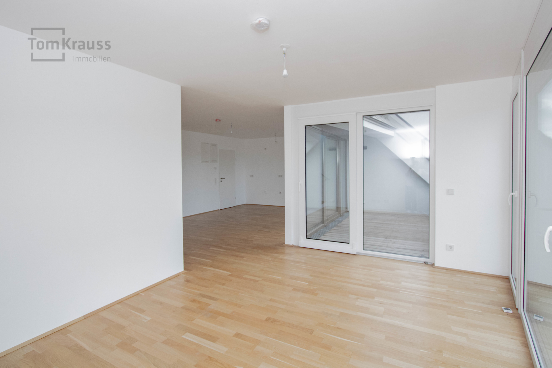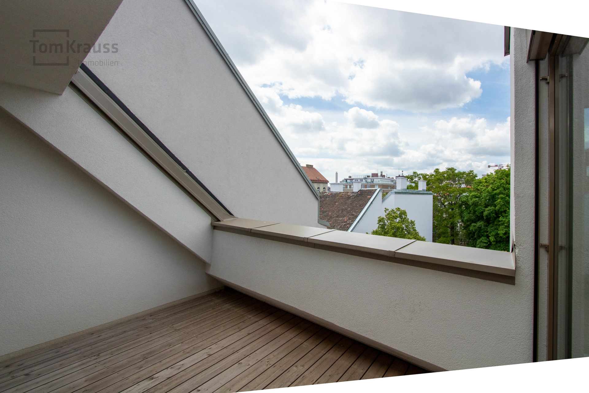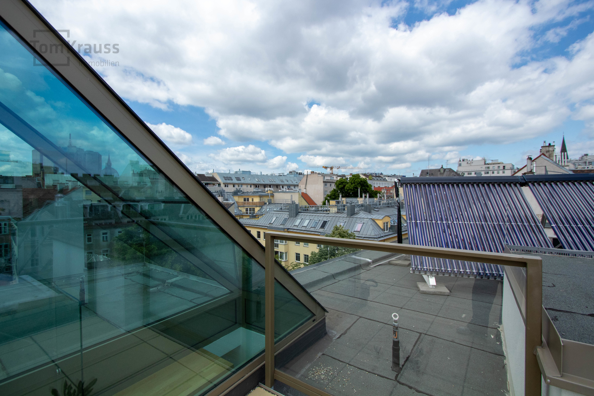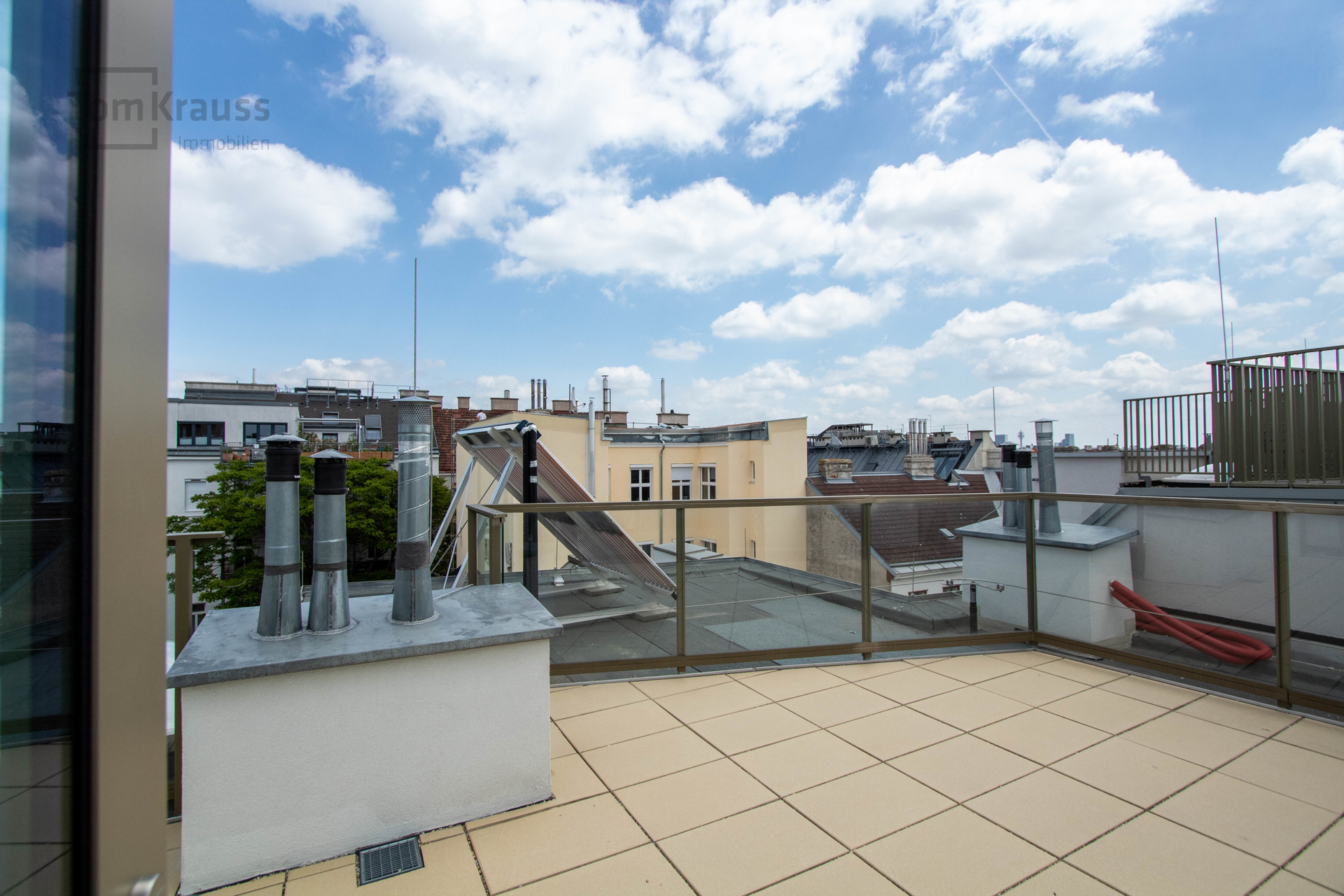 Die Wohnung liegt im 2DG des Hauses und besteht aus einer geräumigen Wohnküche mit direktem Zugang zum Balkon mit Fernblick, einem großen Bad mit WC und einem 15,5 m² großen Schlafzimmer mit bodentiefen Fenstern und Zugang zu einer Terrasse welche in den Innenhof ausgerichtet ist. Das Highlight der Wohnung ist die 23,39 m² große Dachterrasse mit Panoramablick, zu der eine Treppe vom Wohnzimmer aus führt.
