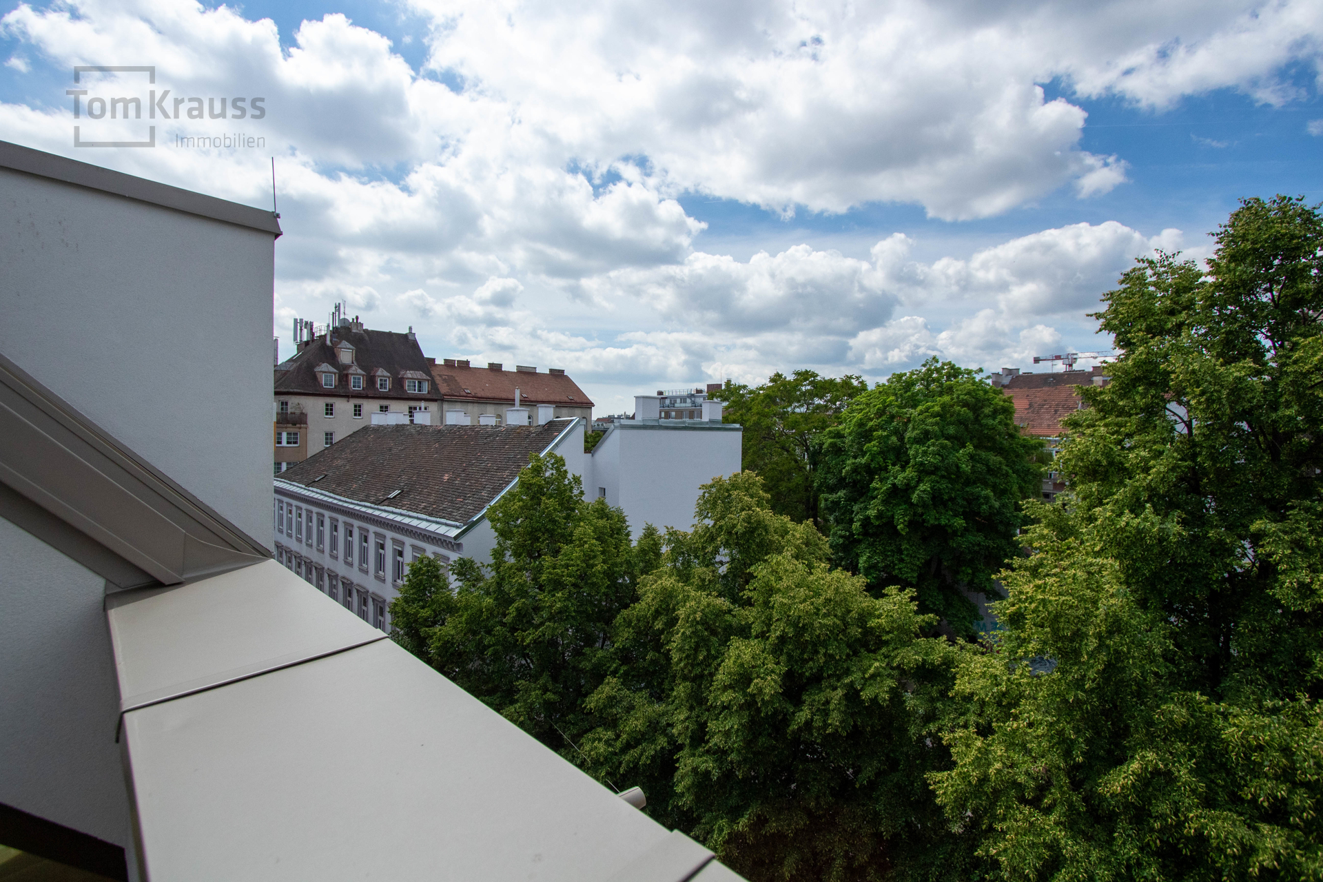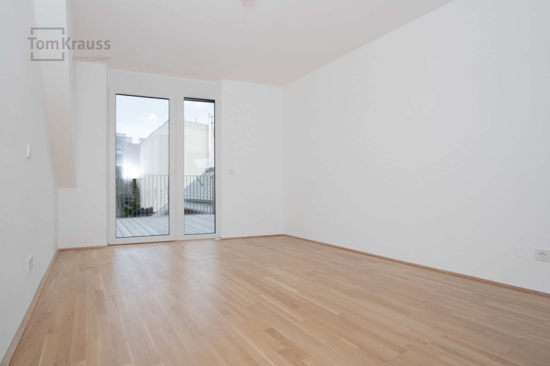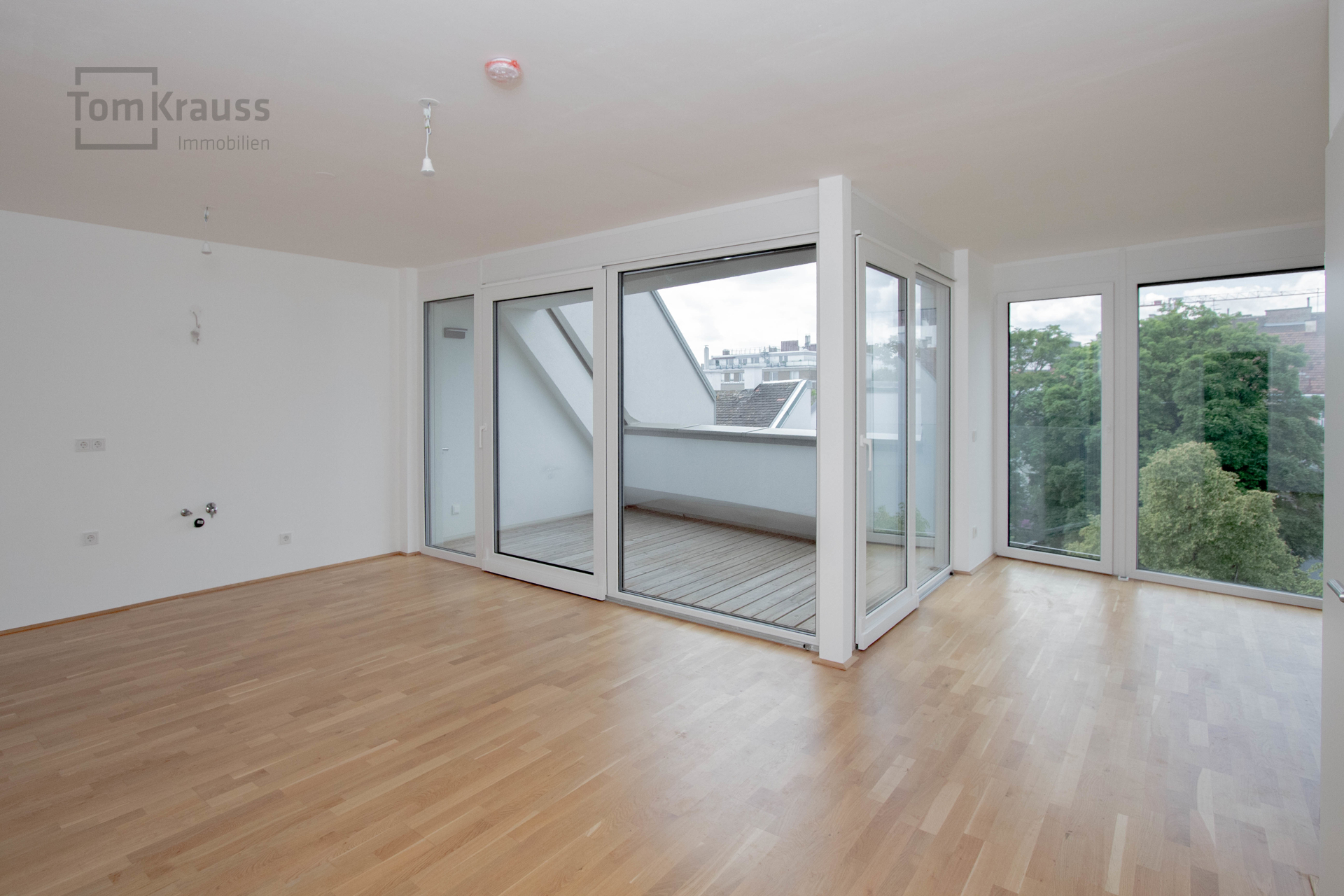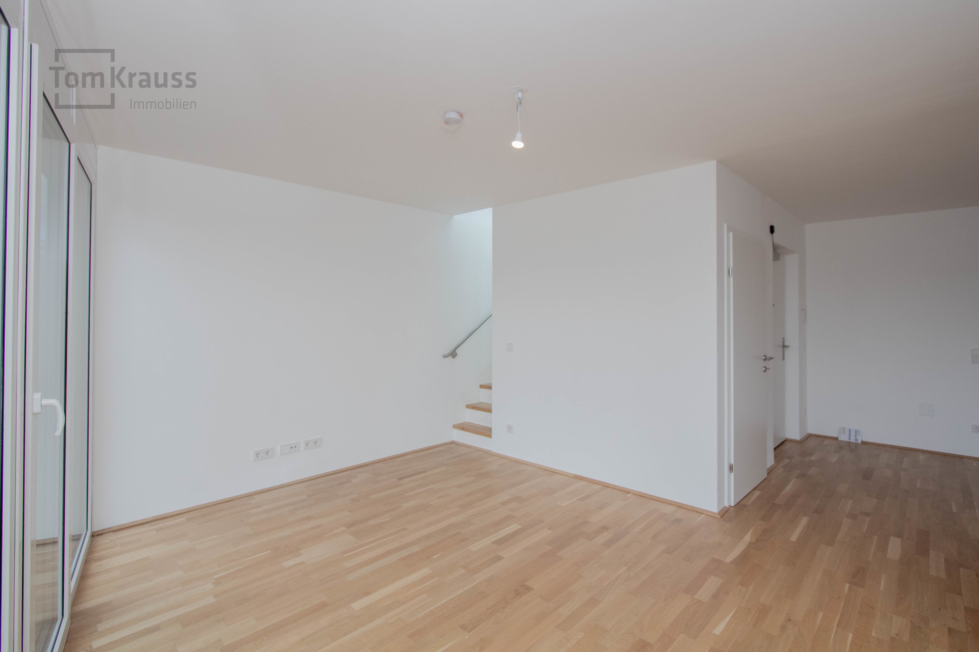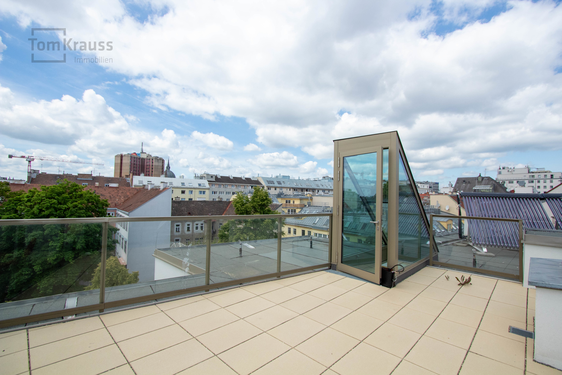 Die Wohnung liegt im 2DG des Hauses und besteht aus einer geräumigen Wohnküche mit direktem Zugang zum Balkon mit Fernblick, einem großen Bad mit WC und einem 15,5 m² großen Schlafzimmer mit bodentiefen Fenstern und Zugang zu einer Terrasse welche in den Innenhof ausgerichtet ist. Das Highlight der Wohnung ist die 23,39 m² große Dachterrasse mit Panoramablick, zu der eine Treppe vom Wohnzimmer aus führt.
