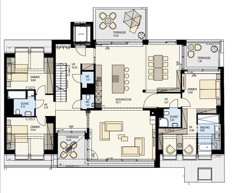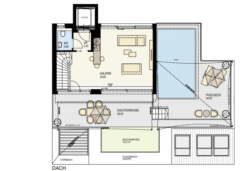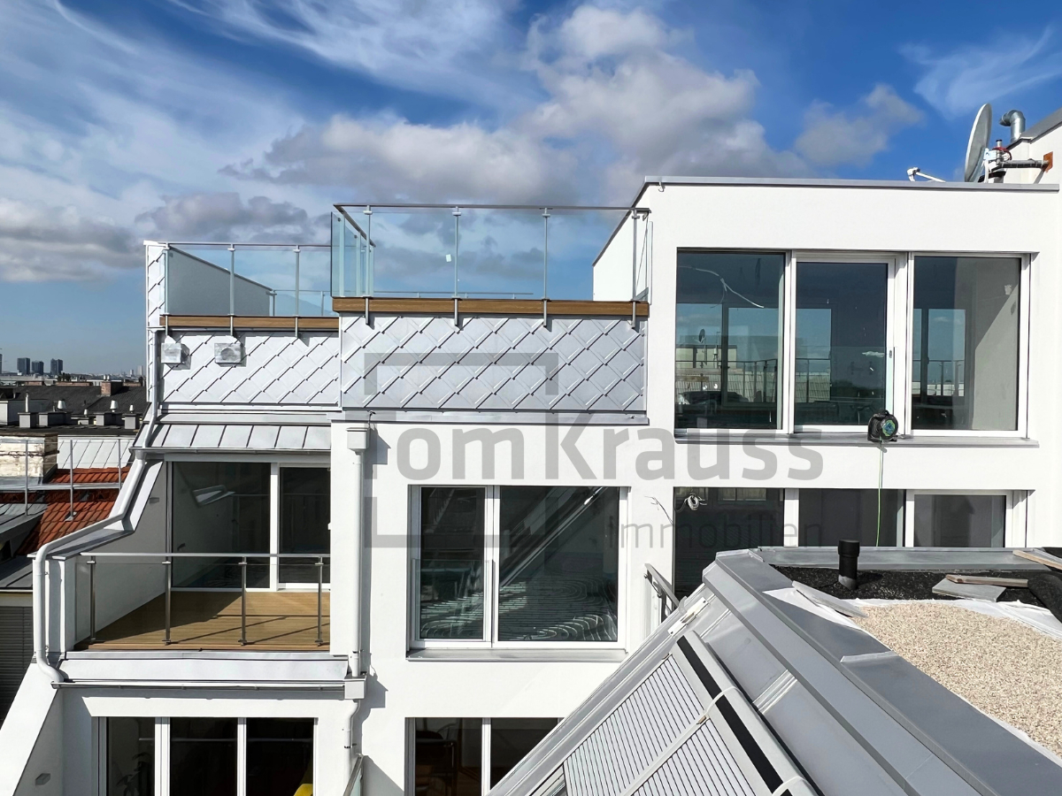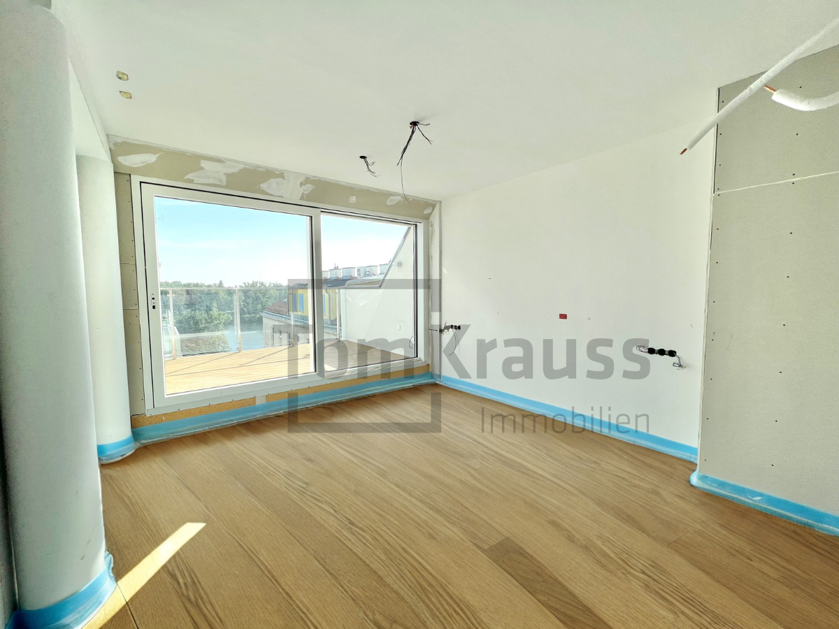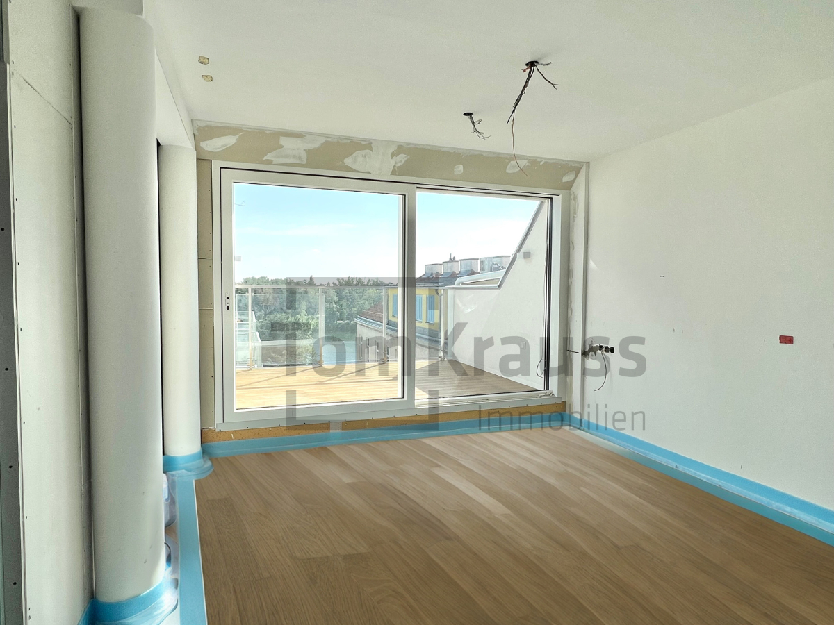 This exclusive top floor penthouse can be reached with its own elevator. It is divided into a large eat-in kitchen (approx. 59.47 m²), master bedroom with en-suite bathroom with bath, shower and toilet as well as terrace access, another bedroom with terrace access, two bedrooms which share a shower room with toilet and a guest toilet. A staircase leads to the gallery floor, where there is access to the roof terrace with pool from which you can enjoy a fantastic panoramic view over the old Danube to the city.