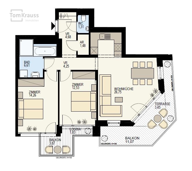 Discover the exclusive feeling of living in the heart of Vienna! This luxurious terrace apartment, which will be built in 2025, offers first-class elegance right in the sought-after 3rd district, Landstraße. With a generous living space of 74 m² spread over three stylishly designed rooms, including two cozy bedrooms, an upscale living experience awaits you.