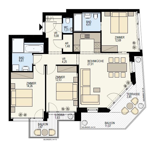 The apartment impresses with its well thought-out room layout and spacious 4 rooms, including 3 comfortable bedrooms and 2 elegant bathrooms. A guest WC is also available to maximize your living comfort. The high-quality furnishings are underlined by the elegant parquet flooring, which creates a warm and inviting ambience.