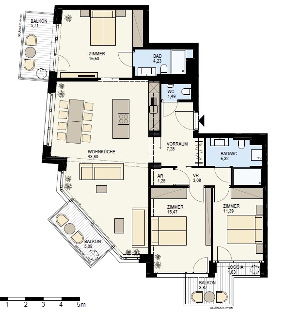 The three bedrooms are ideally laid out and each have their own access to a private balcony, allowing plenty of natural light into the rooms and creating a pleasant atmosphere. Two modern bathrooms with shower and a separate guest WC provide additional comfort and allow for a stress-free morning routine.