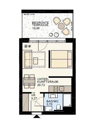 On entering, you enter the vestibule with access to the bathroom with shower and WC as well as the single living room. This offers direct access to the garden terrace and has a separate sleeping area.